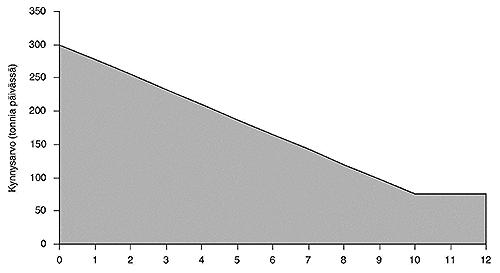 k) eineksiä valmistava laitos, jonka valmiiden tuotteiden tuotantokapasiteetti on vähintään 5 000 ja alle 30 000 tonnia vuodessa, mutta enintään 75 tonnia vuorokaudessa, jos valmiiden tuotteiden tuotantokapasiteetin eläinperäisen raaka-aineen osuus on vähintään 10 painoprosenttia; muuten 300 - (22,5 x A) tonnia vuorokaudessa ja alle 30 000 tonnia vuodessa, kun A on valmiiden tuotteiden eläinperäisen raaka-aineen osuus painoprosentteina;
